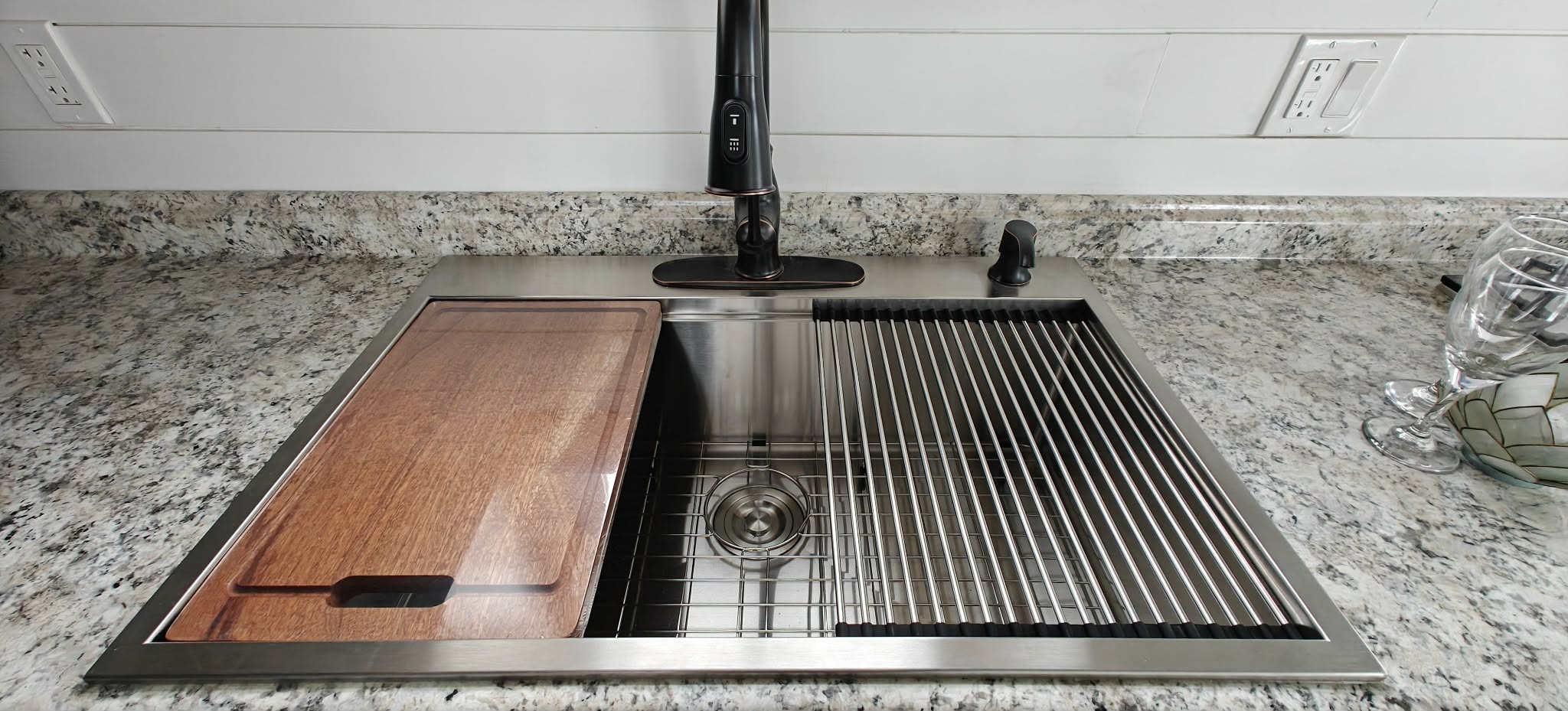Sink: Deep stainless-steel with pull-down spray faucet and accessories.